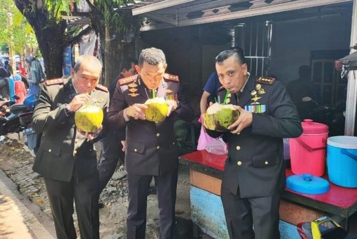 Tak sungkan-sungkan, mereka bertiga bersama-sama meminum kelapa muda berdampingan, di depan warung kaki lima dengan masih berpakaian seragam lengkap masing-masing.