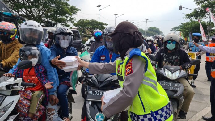 BIN | Indramayu – Menjelang buka Puasa Polwan Polres Indramayu memanjakan pemudik dengan cara memberikan nasi kotak kepada sejumlah pemudik yang sedang melepas lelah di Rest Area Jembatan Timbang Losarang, Kecamatan Losarang, Kabupaten Indramayu.