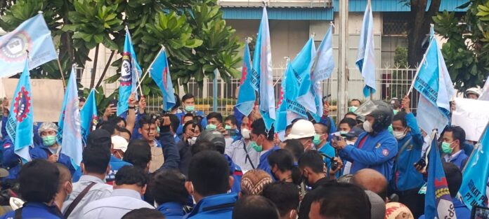BIN | Kabupaten Bekasi – Ribuan karyawan PT Unilever Indonesia TBK, berunjuk rasa terkait PHK yang dilakukan di Jalan Jababeka Raya, Blok Q Kawasan Industri Cikarang Jababeka, Senin (11/04/2022) siang.