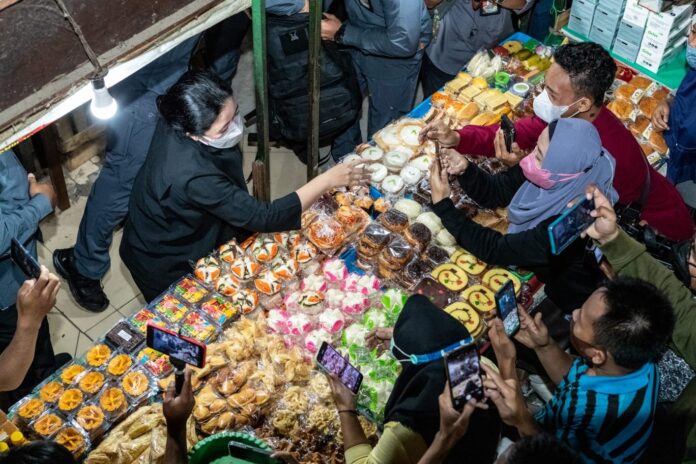 Sesekali, Puan tampak berbincang dengan pedagang seputar harga dan pasokan sembako, termasuk minyak goreng dan tempe.