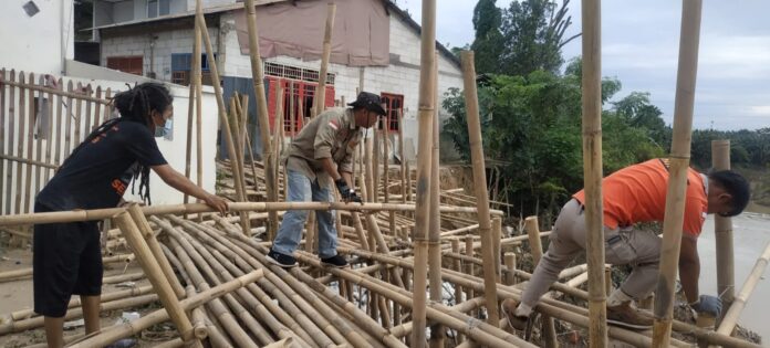 BIN | Kabupaten Bekasi- Badan Penanggulangan Bencana Daerah Kabupaten Bekasi berikan bantuan cerucuk bambu untuk menahan longsor dibantaran kali Bekasi. Diketahui pemasangan itu dibantu Relawan Tangguh Utara (Retara).