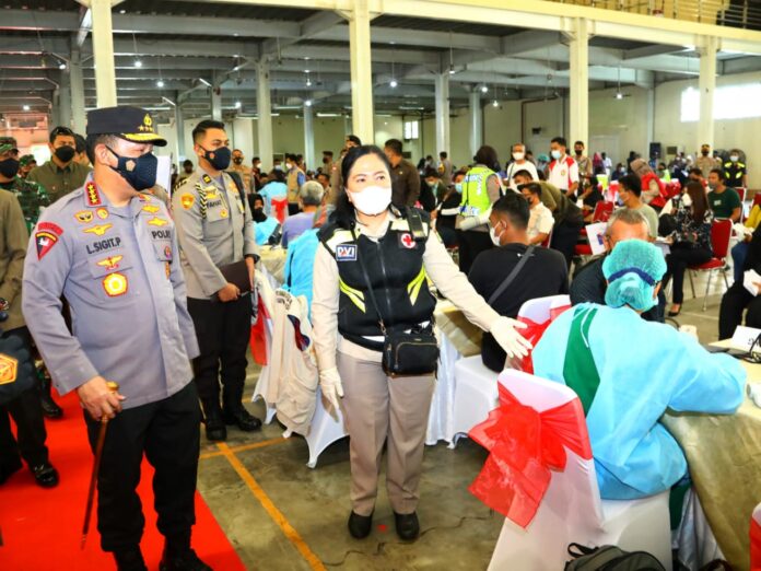 BIN I Bekasi – Kapolri Jenderal Polisi Listyo Sigit Prabowo didampingi Kapolda Metro Jaya, Irjen Pol Fadil Imran meninjau pelaksanaan vaksinasi di Jababeka Convention Center (JCC) Cikarang, Kabupaten Bekasi pada Kamis (17/2/2022) pagi.