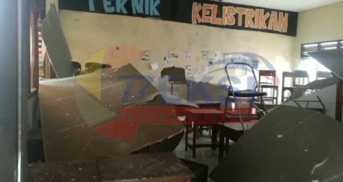 BIN | Bekasi – Pagi yang sedikit mendung di SMKN 1 Cikarang Selatan, Kecamatan Cikarang Selatan, Kabupaten Bekasi, plafon salah satu ruangan kelas diketahui ambruk. Beruntung tak ada korban jiwa.